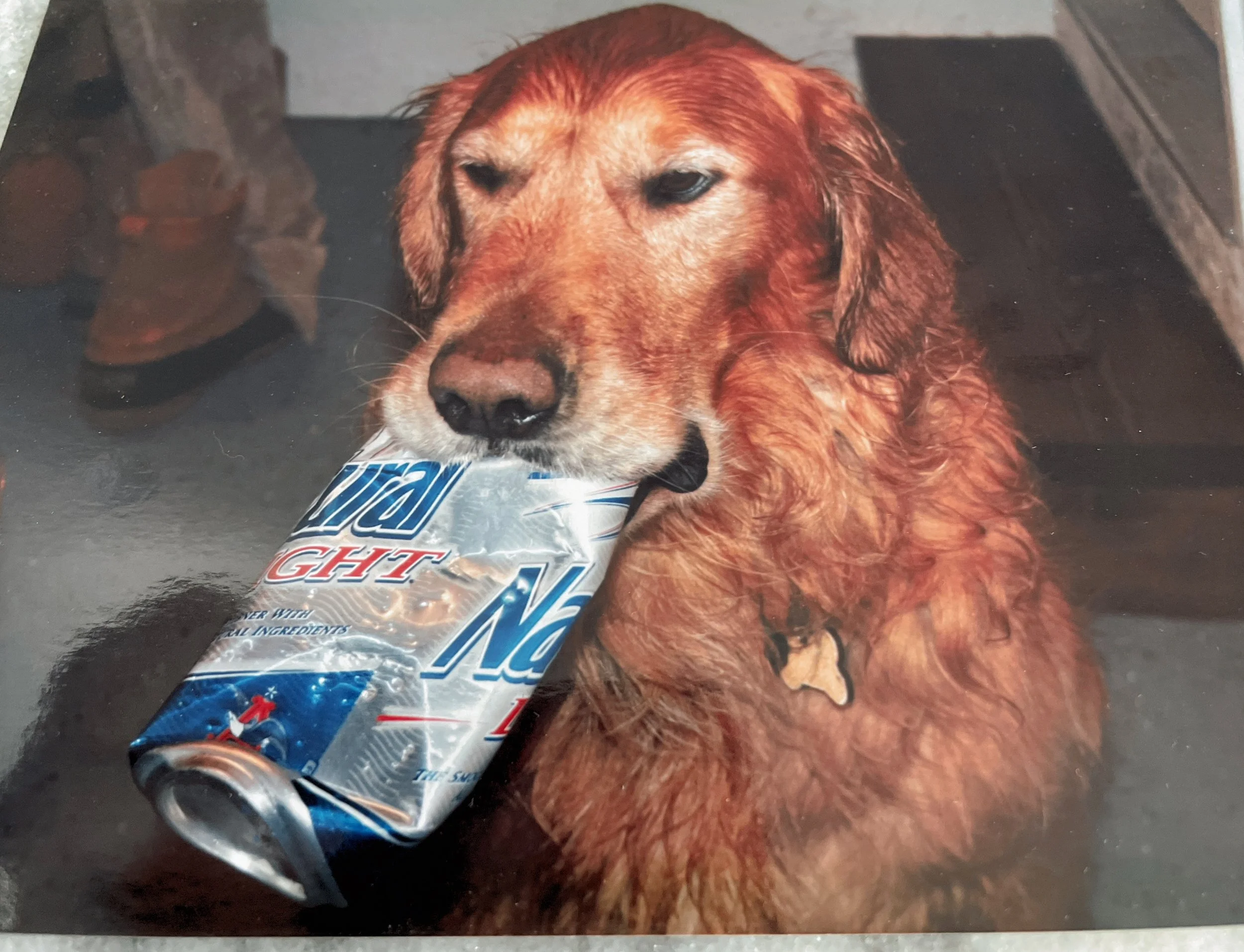 Gunner decided to carry this beer can home. It was wet and nasty out, but he was determined. I sent it in to Golden Retriever Rescue and the picture made it into their yearly calendar.