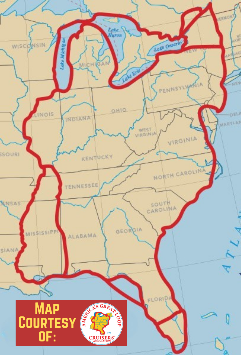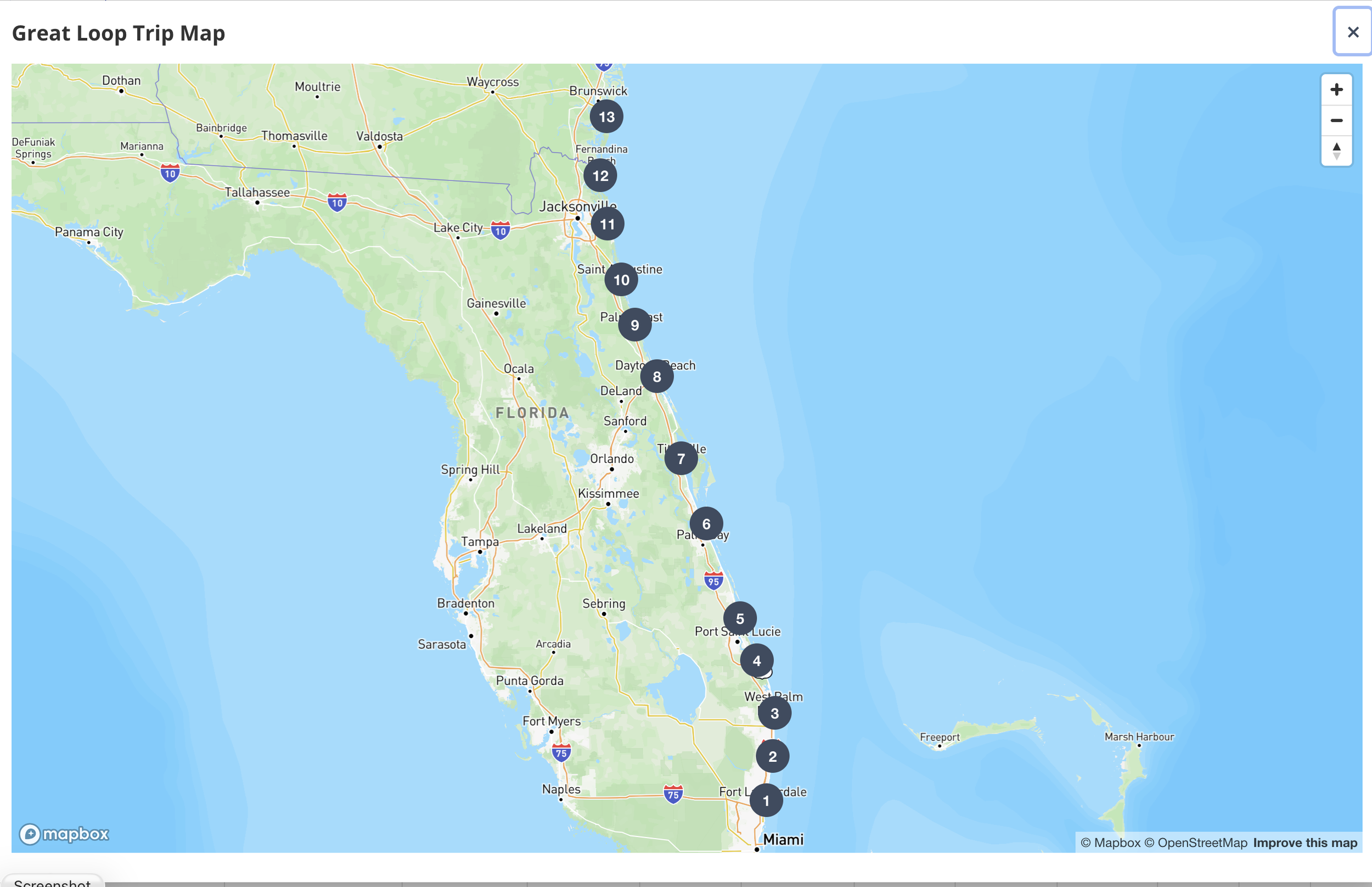 This is an image of our first few weeks on the Great Loop. We started in Fort Lauderdale and headed up the Intracoastal Waterway. In Florida, we had 11 stops for a total of 300 miles. Along the Georgia coastline, we had only 3 total stops (Jekyll, anchoring at St. Catherine’s Island and Savannah) before entering South Carolina and going to Lady’s Island marina and Charleston.